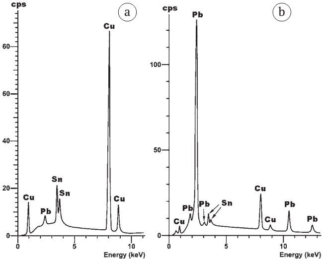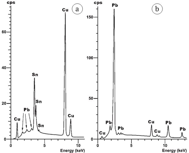 Fig. 3. ED spectra obtained from the main mass (a) and Pb-Cu-As inclusions (b) in a copper bracelet