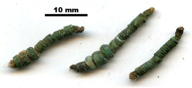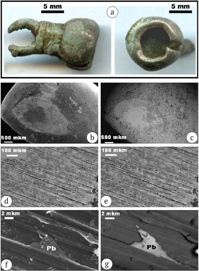 - Кольцевидные бусины. Фрагменты окисленных с поверхности бронзовых украшений длиной 6.5—12 мм; диаметром от 4 до 5.5 мм (рис. 6; а). В основной массе (рис. 6; b—e) выявлены две разновидности бронз (табл. 4): преобладающая низкооловянистая состава Cu0.95—0.98 Sn0.01—0.05Pb0—0.01 и умеренно оловянистая Cu0.91—0.92 Sn0.07Pb0—0.01. В бронзах встречаются единичные микровключения состава Pb0.56—0.88Cu0.12—0.37Sn0—0.07 (рис. 7). Поверхность бусин подверглась окислению; что; очевидно; и придало бусинам зеленый цвет.