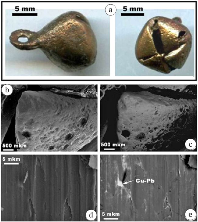 - Грушевидный бубенчик с крестообразной прорезью. Украшение длиной 12.5 мм и диаметром основания 14 мм (рис. 16; а); массивное (рис. 16; b—e); из оловосодержащей латуни (рис. 17; табл. 10) — Cu0.89—0.94Zn0.05—0.08Sn0.01—0.02Pb0—0.01. В латунной массе спорадически встречаются угловатые микровключения размером от 1 × 0.5 до 5 × 2 мкм; подразделяющиеся по составу на медные — Cu0.98—0.99Pb0—0.01Sn0—0.01 и свинцово-медные — Cu0.73Pb0.27.