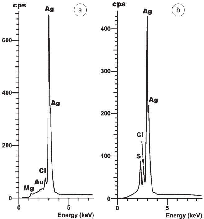 Fig. 29. ED spectra obtained from the main mass (a) and gold-plated areas (b) in barrel bead