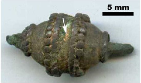 - Шаровидный бубенчик с линейной прорезью. Изделие размером 18 × 13 мм (рис. 8) сложено двумя разновидностями бронз — резко преобладающей низкооловянистой состава Cu0.95—0.97Sn0.03—0.04 и умеренно оловянистой Cu0.91Sn0.08Pb0.01 (табл. 5). На поверхности обнаружена микрокорка окисления гидроксисульфатхлоридного состава — (Pb0.69—0.86Cu0.14—0.42Sn0—0.06)Cl0.06—1.36[SO4]0—0.57(OH)0.54—0.96; вероятно и придающая изделию зеленый цвет.