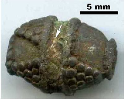 Рис. 30. Внешний вид желудевидной бусины; стрелкой показан участок позолочения
