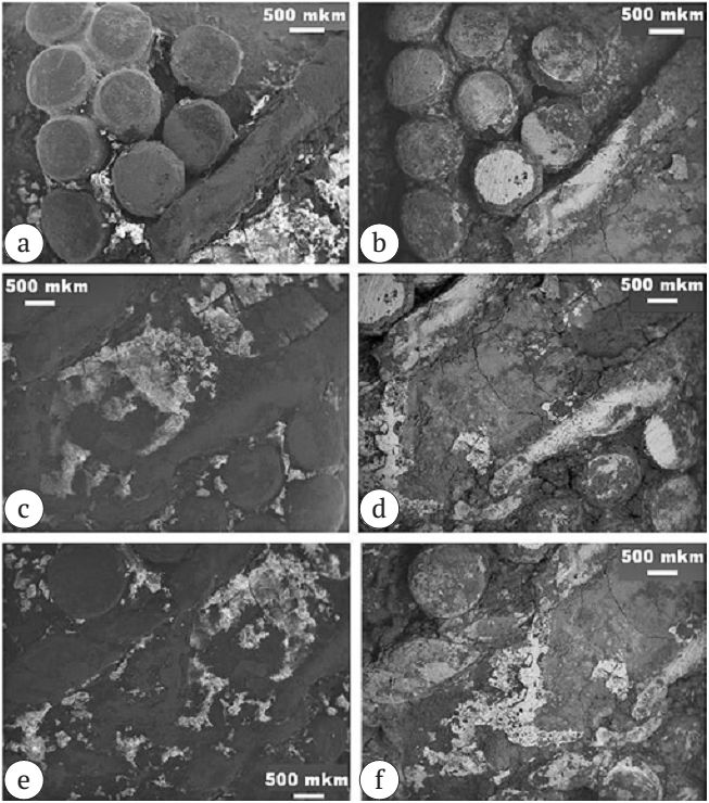 Fig. 31. SEM images of the internal structure of an acorn bead in the modes of secondary (a; c; e) and elastically reflected (b; d; f) electrons
