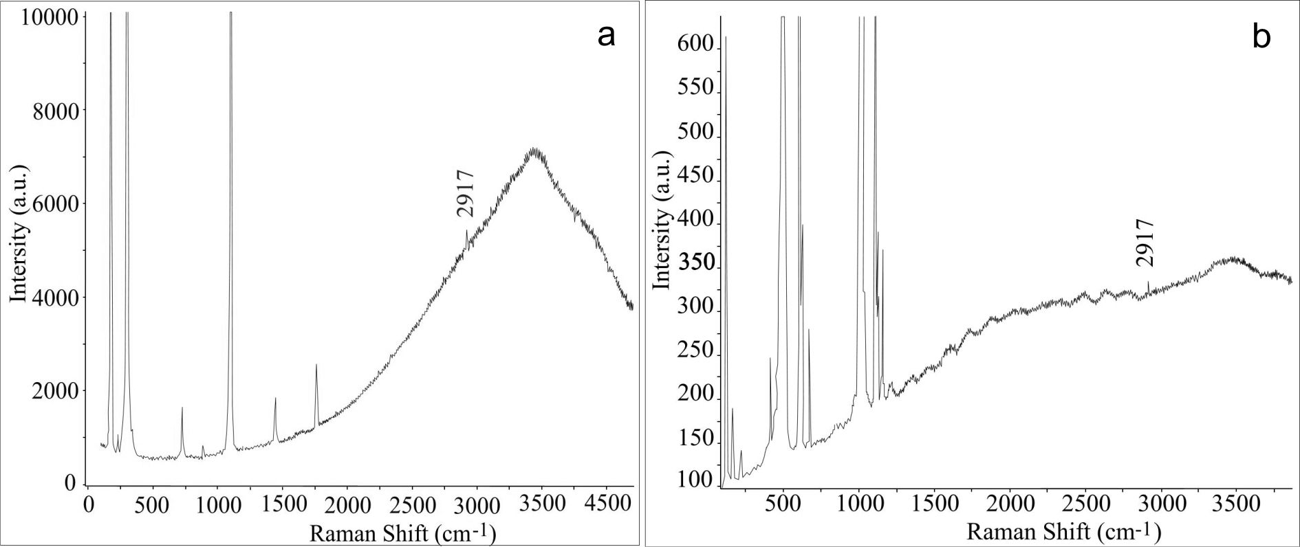 Для определения газового состава флюидных включений проведено рамановское исследование. В доломитах наблюдается очень большой фон (рис. 7, а). Виден пик воды, редко — метана. Пики других газов отсутствуют или перекрыты фоном. Возможно, некоторые газы присутствуют в количествах ниже предела определения. В ангидритах фон заметно ниже, но, как и в доломитах, диагностируется вода, реже с метаном (рис. 7, b).