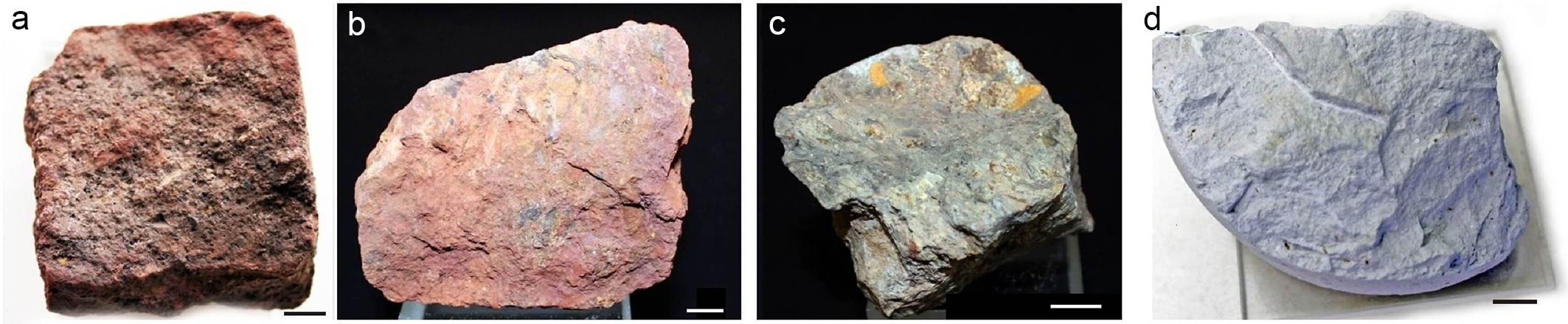 Fig. 2. Mineral types of Central Timan bauxites: a — hematite-boehmite, No. 553/161; b — hematite-chamosite-boehmite, No. 633/15; c — chamosite-boehmite bauxite, No. 633/20; d — boehmite, No. 633/24. Scale bar — 1 cm