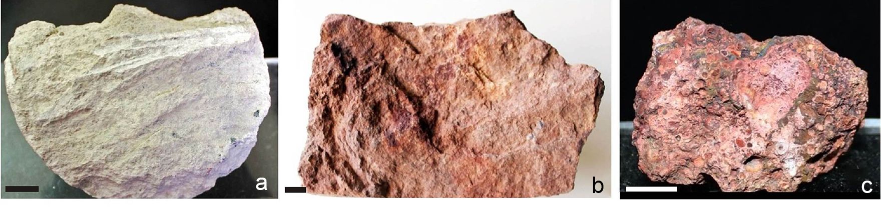 Fig. 3. Lithological varieties of South Timan bauxites: a — mudstone, № 576/19; b — rocky, № 553/163; c — dry, № 576/12. Scale bar — 1 cm