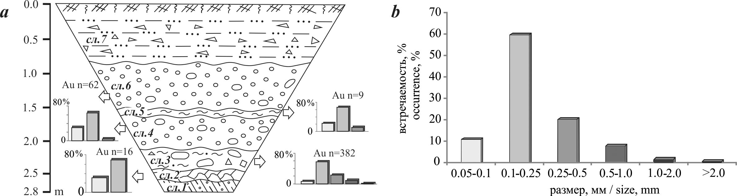 Рис. 7. Диаграммы распределения гранулометрических классов золота: a — отдельно по слоям; b — в целом по канаве. Условные обозначения к схеме канавы см. на рис. 2