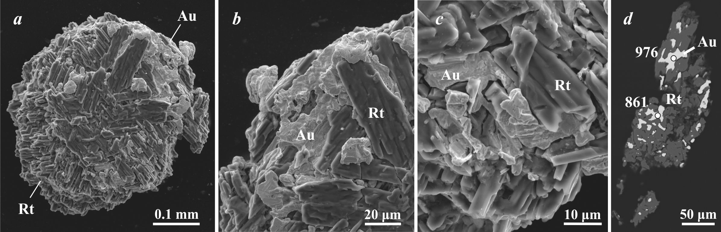 Золото в срастании с рутилом вызывает интерес тем, что в составе рутила присутствуют примеси V (0.4—0.5 мас. %), Fe (0.3—0.7 мас. %), Nb (0.4—1.2 мас. %). Рутил с содержаниями ванадия и ниобия встречается в основных породах, эклогитах, кимберлитах (Королев и др., 2014; Соболев и др., 2011; Zack et al., 2004), а также метаморфических и метаморфогенных высокотемпературных породах (Luvizotto et al., 2009; Luvizotto, Zack, 2009). На Тимане подобный рутил отмечается в алмазсодержащих среднедевонских отложениях пижемской свиты палеороссыпи Ичетью (Средний Тиман) и ассыввожской толще Южного Тимана (Гракова, 2014; Красоткина и др., 2017). Стоит отметить, что О. В. Граковой в ичетьюском рутиле были установлены включения золота и монацита. Источниками ниобиевого рутила на Тимане могут быть либо лампрофиры, либо рудные жилы, вероятно расположенные в рифейских толщах Вольско-Вымской гряды (Красоткина и др., 2017), а также магматические породы основного либо щелочного состава и кимберлиты (Гракова, 2014).