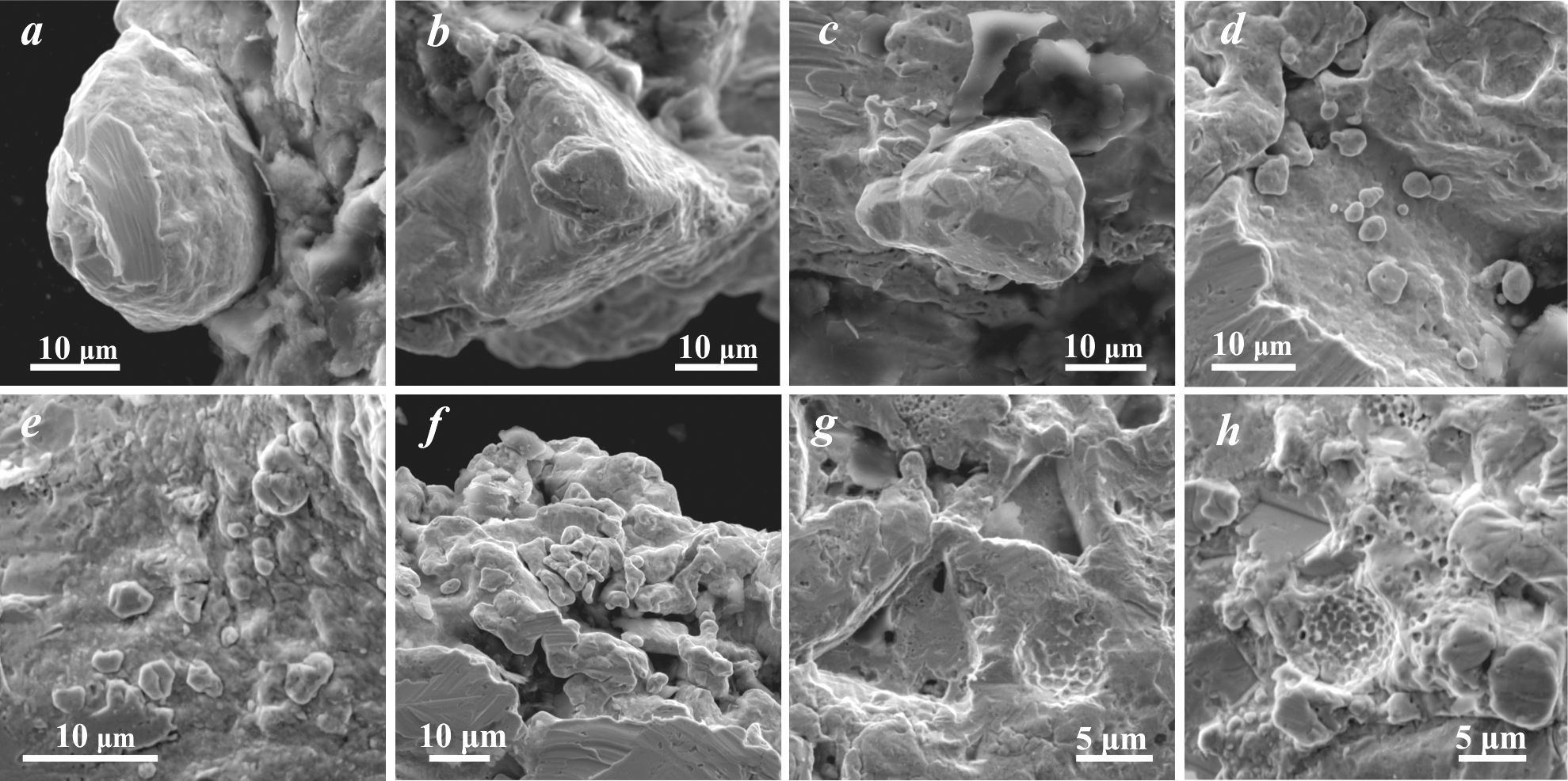 При изучении поверхности частиц золота с помощью сканирующего электронного микроскопа отмечаются наросты округлой, пирамидальной, кристалломорфной формы. Наблюдается также нарастание «нового» золота в виде шариков, пластинок и червечкообразных частиц (рис. 11). Отмечаются скульптуры растворения, которые представлены микроямчатостью. Кроме того, на поверхности имеются отпечатки кристаллов, изредка следы, вероятно, агрегатов фрамбоидального пирита (рис. 11, g, h).