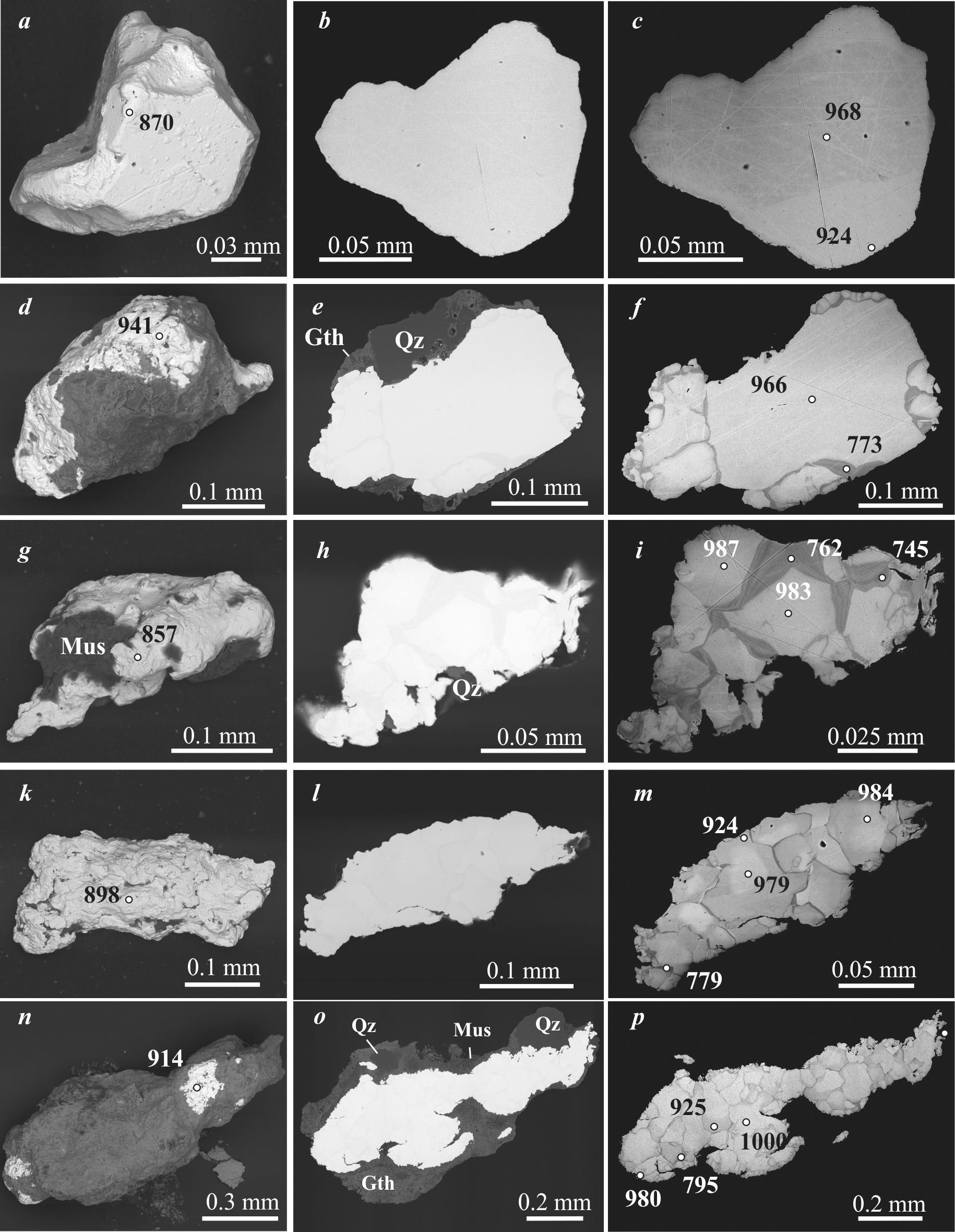Золото наблюдается в сростках с кварцем (рис. 9, а—d). Их доля составляет примерно 10 %. Встречаются золотинки, на поверхности которых установлены мусковит, сидерит и гидроксиды железа (рис. 9, e—i). Отмечаются частицы, полностью заключенные в «рубашку» гидроксидов железа.