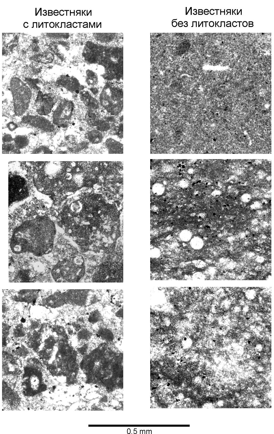 Для решения поставленной задачи была использована обучающая коллекция, представленная монохромными микроизображениями шлифов (фрагменты размером 0.6 × 0.6 мм с формальным разрешением около 0.6 мкм/пиксель) слабоизмененных карбонатных пород (рис. 1). Основу коллекции составили шлифы из нижней части карбонатных турбидитов среднефаменского возраста из разреза на р. Изъяю (Груздев и др., 2023). Путем экспертной оценки коллекция разделена на два класса: без литокластов (литокласты отсутствуют или занимают менее 10 % площади изображения) и с литокластами (литокласты занимают более 30 % площади изображения) (рис. 1). Каждый класс представлен 61 микрофотографией размером 1000 × 1000 пикселей. Изображения с промежуточным содержанием литокластов (10—30 % площади изображения) в обучающую коллекцию не включались.