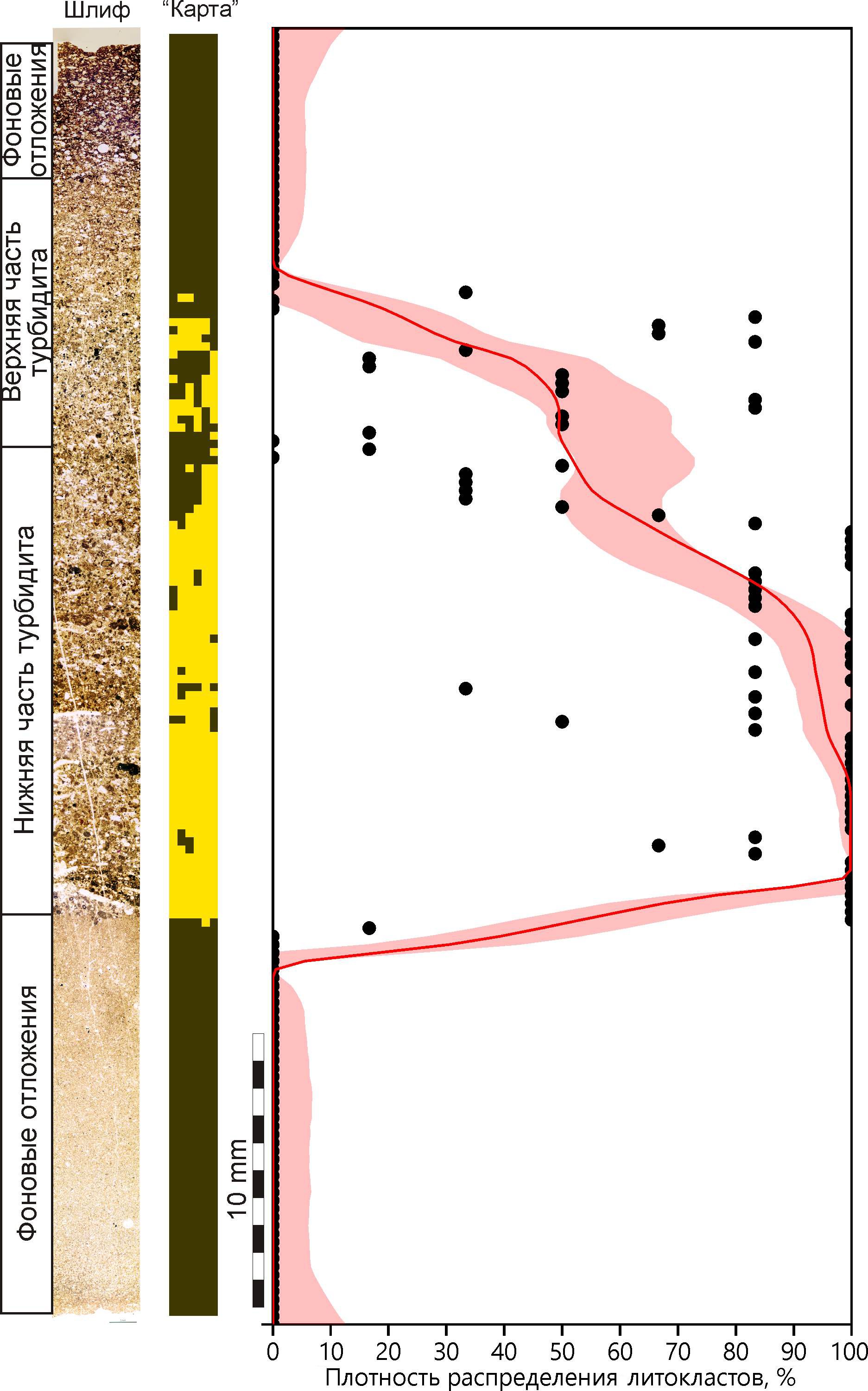 На рисунке 3 приведен пример результата работы программ по панорамному изображению ориентированного большого шлифа, сделанного из циклита карбонатного турбидита. Верх изображения отвечает верхней части турбидита. На графике и »карте» шлифа видно градационное снижение «плотности распределения» обломочной разности известняка снизу вверх по циклиту. В случае карбонатных турбидитов «плотность распределения» литокластов характеризует распределение аллохтонной компоненты в породе. Следует отметить, что значение «плотности распределения» литокластов не равно содержанию литокластов в породе, хотя и связано с этой величиной. «Плотность распределения» литокластов показывает, насколько часто на определенной части шлифа встречаются участки с содержанием литокластов более 30 %.