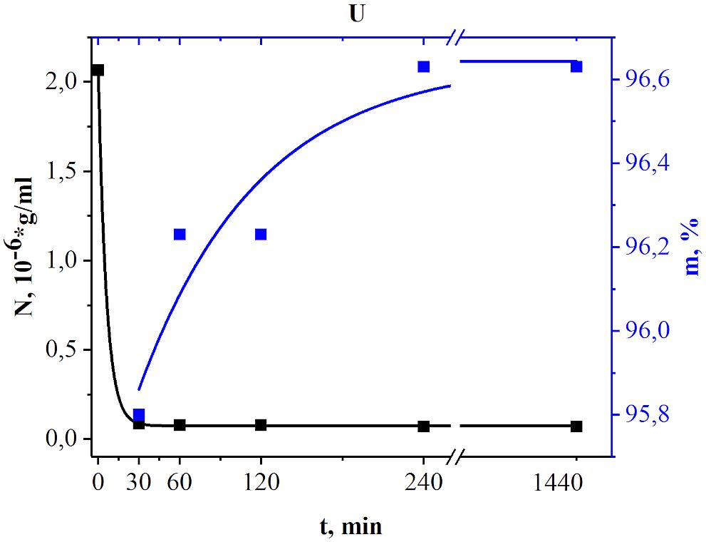 Рис. 3. Показатели сорбции урана (черный цвет — концентрация радионуклида в растворе после сорбции, синий — степень извлечения)