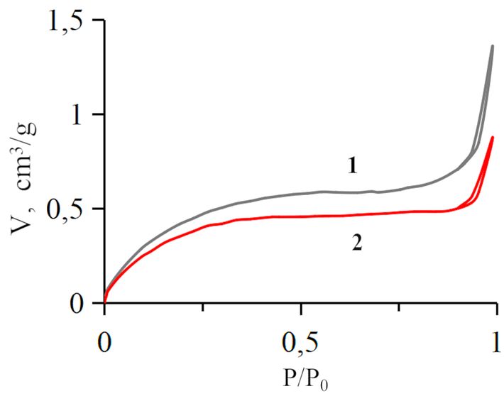 Наиболее важными характеристиками сорбентов любого происхождения являются удельная поверхность и объем микро- и макропор материалов. Для изучения поверхностно-пористых характеристик нами использован метод низкотемпературной адсорбции азота. Как видно на рис. 6, изотермы адсорбции-десорбции N2 образцов Sb-1 и Sb-2 качественно одинаковы. На основе анализа формы этих изотерм можно сделать вывод, что они относятся к типу IV (a) в соответствии с классификацией IUPAC (Thommes, et al., 2015). Характерной особенностью изотермы IV типа является четко выраженная петля гистерезиса, обусловленная капиллярной конденсацией, которая, как правило, возникает в мезопорах. Следует отметить, что изотермы IV типа наблюдаются для многих промышленных мезопористых адсорбентов. Принимая во внимание положение (почти вертикальное) ветвей адсорбции и десорбции, петли гистерезиса, показанные на рис. 6, следует отнести к типу H1.