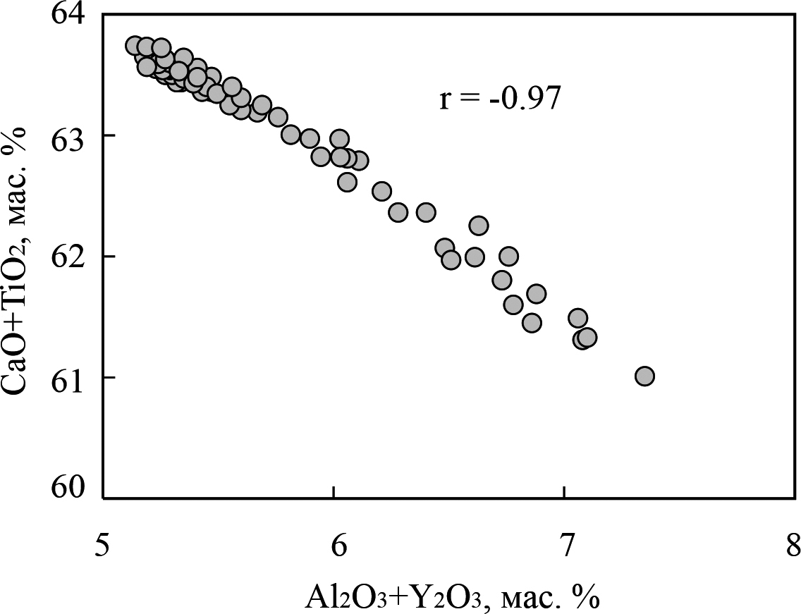 Корреляционная матрица (табл. 3) демонстрирует высокую и весьма высокую корреляцию между рядом элементов и их суммами. Весьма высокая корреляция связи обнаружена между суммарным содержанием оксидов кальция и титана и суммой оксида иттрия и глинозема, что согласуется со схемой изоморфизма Ca2++Ti4+↔[легкие РЗЭ, Y]+AlVI,Fe3+ (Russell et al., 1994). Коэффициент корреляции составляет –0.97 (рис. 4).