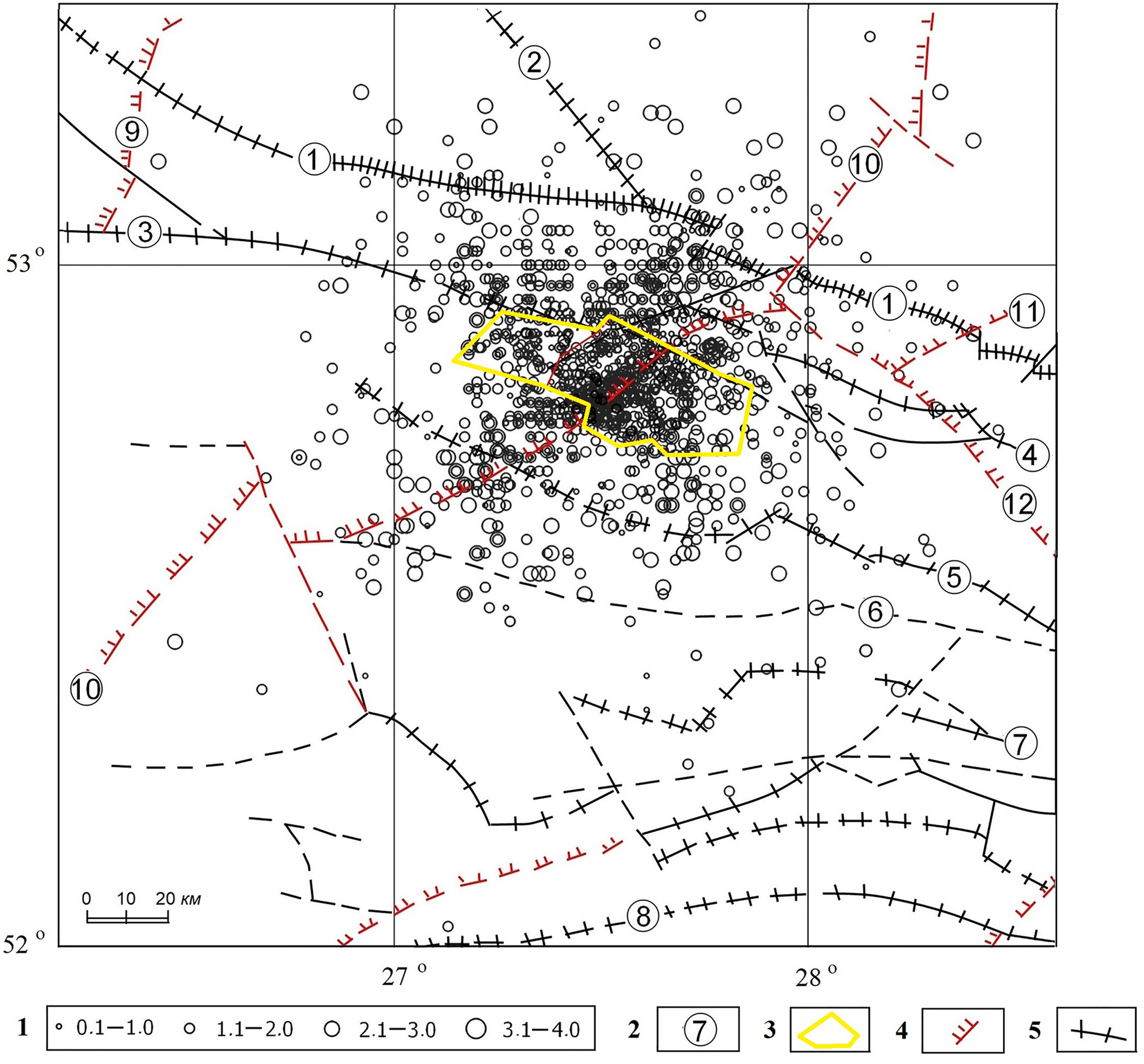 1 — магнитуда землетрясения; 2 — разломы (1 — Северо-Припятский, 2 — Налибокский, 3 — Ляховичский, 4 — Речицкий, 5 — Червонослободско-Малодушинский, 6 — Копаткевичский, 7 — Шестовичский, 8 — Сколодинский, 9 — Выжевско-Минский, 10 — Стоходско-Могилевский, 11 — Кричевский, 12 — Чечерский); 3 — граница шахтных полей Солигорского горнопромышленного региона; 4 — разломы, не проникающие в чехол; 5 — разломы, проникающие в чехол
