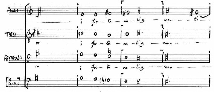 Filli: Mori, cor mio, ch’io moro. | Филли: Умри, моё сердце, ибо я умираю. | Параллелизм трезвучий в партии b. c.: e, D, E | V, басовая клаузула; при повторении – I, басовая клаузула; V, басовая клаузула; I, басовая клаузула; IV, басовая клаузула; VII, басовая клаузула; III, басовая клаузула |