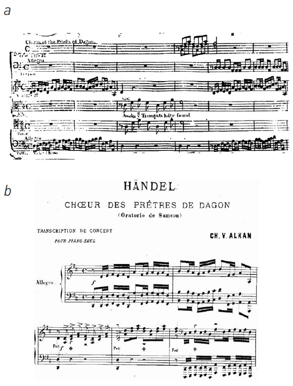 Ил 1. Г. Гендель. Хор жрецов Дагона из оратории «Самсон»: а – Гендель. Партитура 1763 г. (т. 1-6); b – Алькан, транскрипция (т. 1-5)
