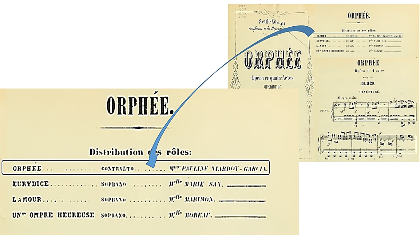 Впитав в себя веяния новых эпох, мифологический идеал Орфея, олицетворявший великую силу музыкального искусства, идеи самоотверженности, преданной любви, возвышенности чувств, в XIX в. обрел новые смыслы. Сложно сказать, переживали ли западные музыканты-романтики «осиротевшую лиру» вместе с Николаем Карамзиным («Смерть Орфеева», 1795) или «полноту томленья» по его печальной участи с Иваном Ивановичем Козловым («Гимн Орфея», 1839), но наверняка были увлечены «Urworte. Orphisch»21 И.В. Гёте (1817). Одно за другим рождаются музыкальные прочтения «орфенианы». В 1854 г. Ф. Лист создал Четвертую симфоническую поэму «Орфей»22; в 1858 г. Жак Оффенбах представил публике оперетту-буфф «Орфей в аду». В 1859 г. появилась обновленная редакция оперы на французском языке в 4-х актах. Ее по рекомендации Дж. Мейербера создал Г. Берлиоз, который убрал из названия имя Эвридики и поручил партию Орфея низкому женскому голосу, тем самым положив начало традиции выступления в данной партии певицы-женщины. Известно, что данная версия оперы Глюка на французском языке была заказана конкретно «под» Полину Виардо (1821–1910), исполнявшую партию 138 раз. Тогда же появилась фортепианная редукция берлиозовской редакции «Орфея» Т. Риттера, текст которой, судя по титульной странице, был адресован генеральному директору театра «Лирик» для постановки. Там же указан актерский состав постановки и отчетливо видно, что партию Орфея исполняет Полина Виардо в тесситуре контральто (ил. 2).