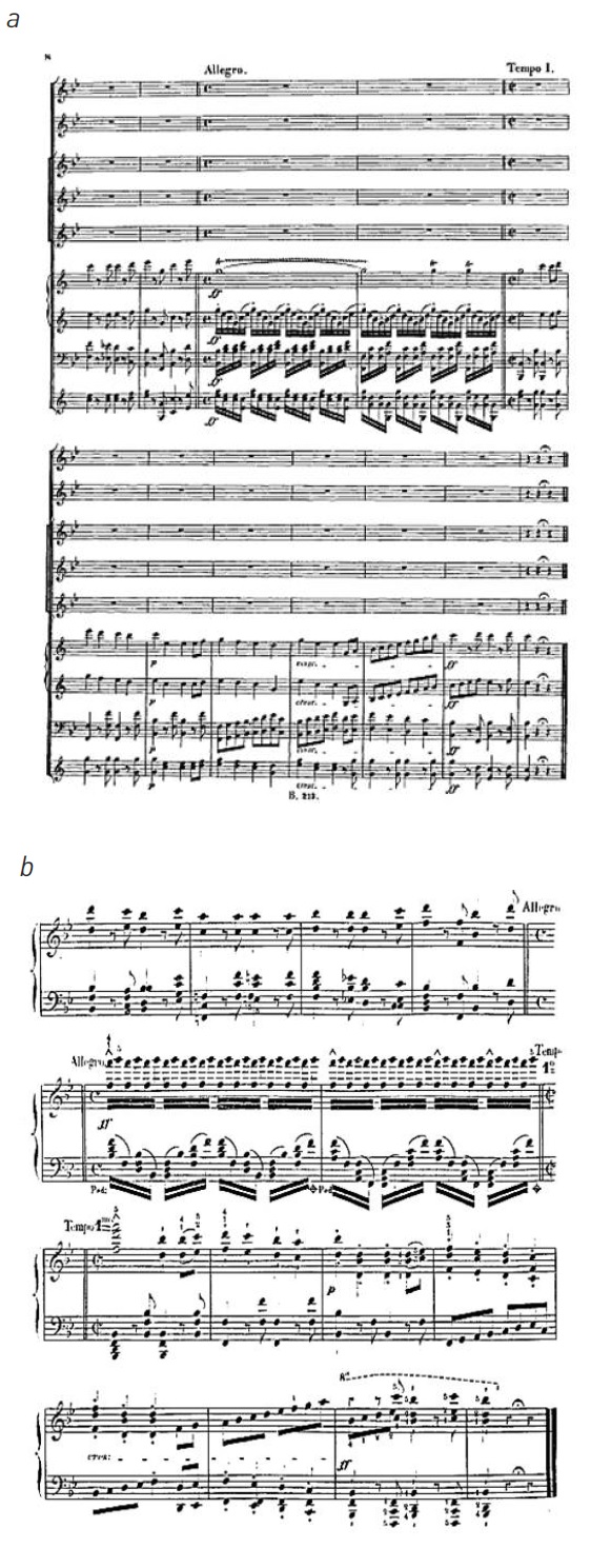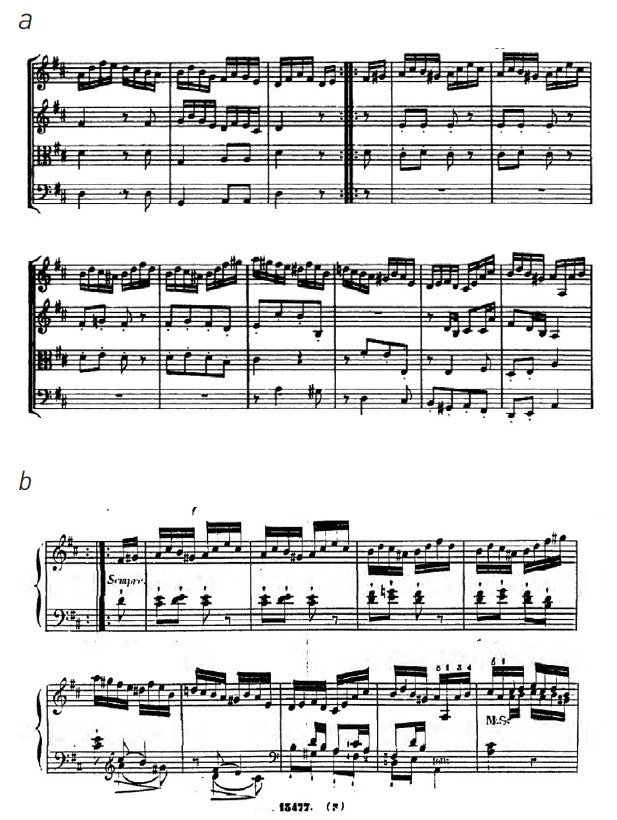 Ил. 4. Й. Гайдн, финал 38-го квартета оp. 64 № 5 D-dur: а – Гайдн. Партитура В. Альтмана, 1980 (т. 9-16); b – Алькан. Транскрипция (т. 9-17)