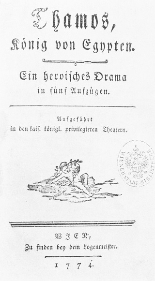 «Тамос» / «Thamos» Моцарта, согласно Кёхелю26, относится к оперному жанру, но на деле эта композиция представляет собой музыкальное сопровождение театральной постановки, или актерскую музыку. Сюжет исторической драмы Тобиаса Филиппа фон Геблера27 «Тамос, король Египта», на который положено сочинение Моцарта K345/336a, переносит нас в Древний Египет времени ок. 3000 г. до н.э. Внушительное по размерам произведение (семь музыкальных номеров: хоровых, сольных сцен и интерлюдий) не только выходит за рамки театральной «музыки сопровождения», но и отражает все признаки оперного стиля композитора.