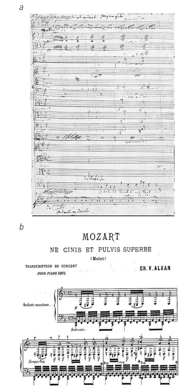 Ил. 6. В.А. Моцарт. Сцена «В пыли и пепле» («Ne pulvis et cinis superbe») из музыки к постановке «Тамос, король Египта» (K. 345): a – В.А. Моцарт. Манускрипт 1779 г. № 7, Andante Moderato (т. 1-3); b – Алькан. Транскрипция Ne pulvis et cinis superbe, Andante maestoso (т. 1-3)