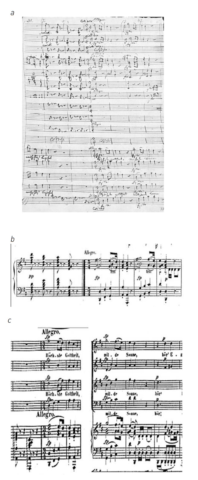 Ил. 7. Моцарт. Хор D-dur, Allegro из музыки к постановке «Тамос, король Египта»: a – Моцарт. Манускрипт 1779 г., Allegro (т. 1-4); b – Алькан. Транскрипция. Allegro (т. 1-4); c – транскрипция Брислера, Хорна, Штерна, Ульриха, клавир. Allegro (т. 1-4)