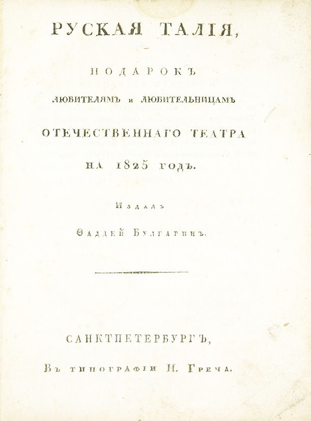 Единственная публикация отрывков из комедии, которую увидел Грибоедов, связана с именем Ф.В. Булгарина. Последний готовил к выходу театральный альманах «Русская Талия на 1825 год». Издание вышло в свет в конце 1824 г., и в нем опубликовали часть первого действия и почти все третье действие комедии9.