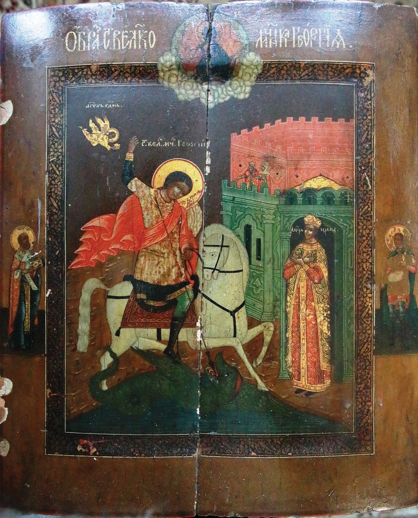 At its core, the icon by G.N. Zhuravlyov represents the second type of iconographic plot, focusing on the rescue of Tsarevna Elisava by Saint George. The masterful execution reveals the influence of the Syzran icon-painting workshop, evident in characteristic ornamental decorative element on a wide black bevel, alternating image in gold of a chamomile flower, a petal, and a trefoil [11, p. 10]. Positioned at the pommel, amidst the clouds, is a waist-length depiction of Christ the Pantocrator, blessing with both hands. The upper field of the icon carries the inscription “Image of the Holy Great Martyr George” in an elongated half-uncial. Along the side margins, there are images of patron saints (though the inscription is illegible, likely depicting St. Nicholas the Wonderworker and St. Martyr John the Warrior). In the center, inscriptions above the characters read: “Angel of the Lord,” “Holy Great Martyr George,” and “Daughter of the Tsar.” The color scheme is distinctive, blending warm brown and ocher tones with a green scheme. The general background, as well as the faces of St. George and Elisava, is in the darkened tonality, with contrasting dark brown under paint and areas sharply lightened with white on the forehead, cheeks, and neck. The central composition features Saint George riding on a white horse, accentuating its luminosity through the white mane, tail, and hooves. Saint George’s calm, confident gaze is directed at the viewer. He is adorned in military regalia, a dark green tunic (kamizia) with golden cuffs, a metallic golden lorica, and a scallop-like flowing end of a red cloak, marked by sinuous lines of whitewash. He holds the reins with his left hand, and raises a spear with a cross-shaped pommel with his right hand, barely touching the dragon’s mouth. Notably, the traditional helmet of a Byzantine warrior is rarely found in the iconography of St. George the Victorious. In the upper right corner, an atypical image emerges, an angel holding a crown for St. George, a detail absent in the G.N. Zhuravlyov icon. Such atypical images, like the fall of the helmet (seen in an icon from the late 15th to early 16th centuries in the National Museum “Kiev Art Gallery”) or its replacement with a heavenly martyr’s crown (seen in an embroidered shroud from the Konevetsky Monastery on Lake Ladoga, early 16th century, State Russian Museum) [7], were common in the iconography of the 15th–early 16th centuries, enriching the narratives with intricate details.