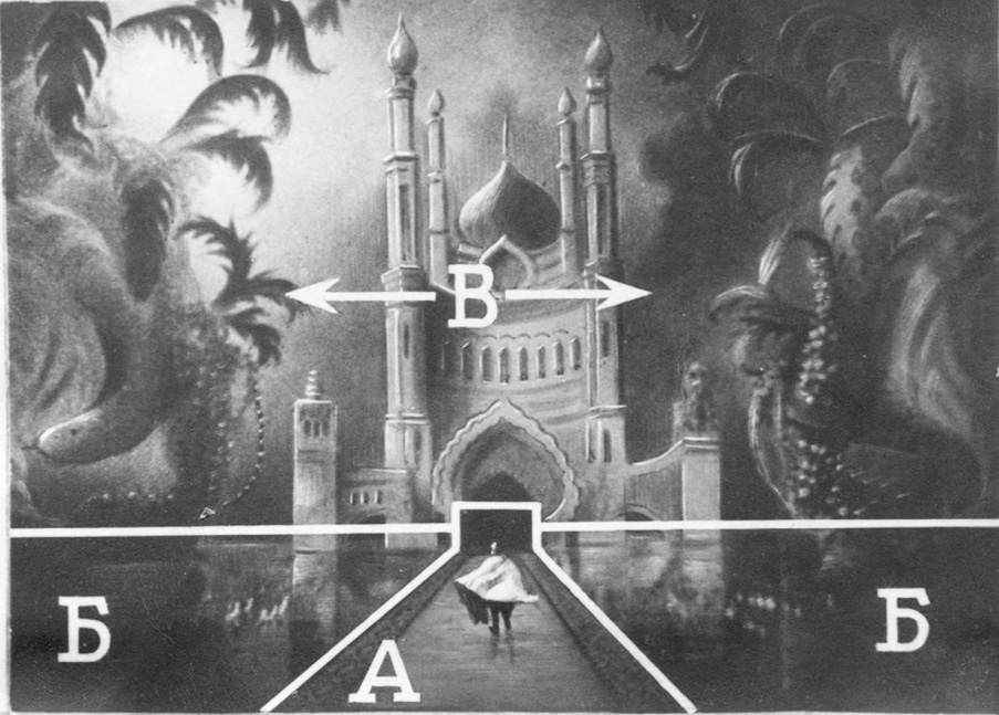 Фото 15. Комбинированный кадр. Линии раздела показывают: В – дорисовка, Б – макет, А – натура (дорожка снята на натуре)