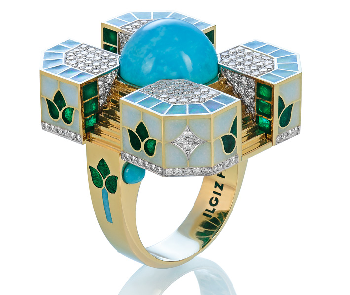 Кольцо «Утро в Самарканде» из коллекции «Самарканд» (2018). Золото, бриллианты, лазуриты, бирюза. Автор: Ильгиз Фазулзянов