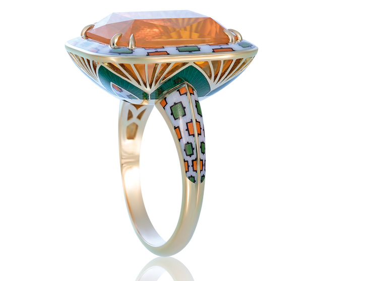 Кольцо «Вечерние купола Самарканда» из коллекции «Самарканд» (2018). Золото, спессартин, горячая ювелирная эмаль. Автор: Ильгиз Фазулзянов