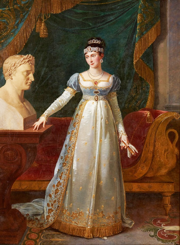 Художественная образность ампирной моды эпохи Наполеона была также представлена на картинах художников барона Р. Лефевра, Ж.Б. Изабе и др., через которые можно проследить эволюцию дамского костюма. Многообразие ювелирных украшений, обуви и причесок изображено на многочисленных портретах Жозефины Бонапарт и сестёр императора. К числу таких относится работа живописца Р. Лефевра «Портрет Полины Боргезе, урожденной Бонапарт, сестры Наполеона I» (ил. 7). Героиня одета в придворное белое платье из атласа, состоящее из лифа, юбки и трена. Вышивка на юбке платья в виде небольших цветов, гирлянд на подоле, а также на голубом трене отражает свойственные для ампира флоральные мотивы в виде стилизованных цветов и листьев. Кроме этого стоит отметить их сходство с рисунками художника по текстилю Жан-Франсуа Бони, создававшего эскизы для лионских мануфактур. Происхождение подобной вышивки, а также традиции украшать край юбки платья широкой золотой бахромой берет свое начало с коронационной туники императора Наполеона, которую можно увидеть на картине Ф. Жерара «Портрет Наполеона Бонапарта» (ил. 8). Подобная вышивка на женских придворных платьях есть и в работах кисти Р. Лефевра, в том числе картинах «Портрет Мари-Жюли Клари, королевы Неаполя, с дочерью Зинаидой Бонапарт» (ил. 9) «Портрет Летиции Бонапарт» (ил. 10). Скрупулезная прорисовка платьев членов семьи Бонапартов и приближенных ко двору, бесспорно, была рекламой достижений лионских мануфактур, а пояс, брошь, серьги, две диадемы и другие украшения и аксессуары отражали мастерство французских ювелиров.