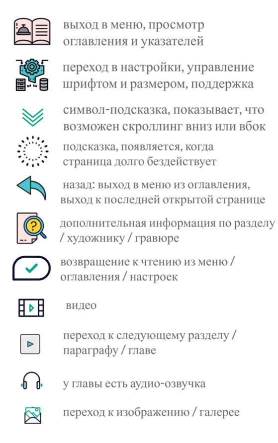 Выход в меню позволит пользователю остановить свое чтение в нужный момент для того, чтобы осуществить переход к оглавлению, указателям, дополнительным главам и галерее. При выходе из меню, например в именной указатель, иконка самого меню сохраняется, и к ней можно вернуться двумя путями: нажав на стрелочку «назад» либо на саму иконку. Меню является важнейшим связующим элементом.