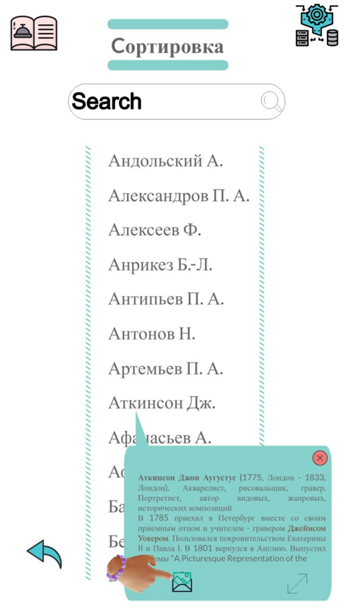 Мультимедийное издание позволит обогатить и упростить систематизацию информации по указателям. Все они должны быть оснащены поисковой строкой вверху по центру, а также возможностью сортировки по алфавиту, стране или хронологии, что отвечает задачам того или иного пользователя. В именном алфавитном указателе имя каждого художника дополнительно оснащено биобиблиографической справкой. При нажатии на экране появится всплывающее окно с краткой информацией. Если читателю потребуются более подробные сведения, он может перейти к полной биографии, нажав на нужную кнопку.