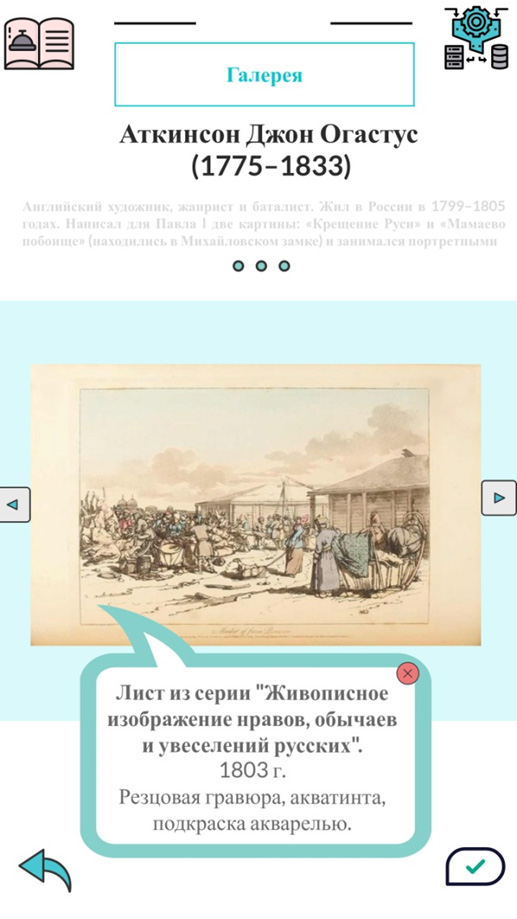 Основной шрифт выбирается такого размера, который удобен пользователю; данной функцией можно управлять из настроек. Все элементы с дополнительной информацией выделяются другим цветом. Текст при нажатии на них появляется в небольшом окошке. Например, таким образом выделены имена художников, тогда как информация во всплывающем окне включает биографическую справку и портрет. Кроме этого, добавляется кнопка «подробнее», по которой читатель сможет перейти на страничку персоналии с детальной информацией. Также выделяются термины, названия произведений – все, что может быть проиллюстрировано или оснащено дополнительными материалами.