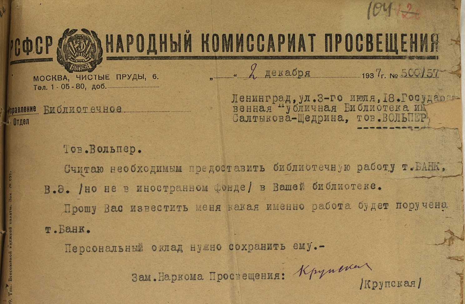 25 декабря 1937 г. В.Э. Банк написал на имя директора А.Х. Вольпера следующее заявление: «Прошу Вас, на основании распоряжения Зам. Наркома Просвещения Н.К. Крупской, предоставить мне вновь работу в Гос. Публичной библиотеке». На этом заявлении была наложена резолюция директора: «Зачислить гл. библиотекарем по II отд.31 с 22/XII-37 г.