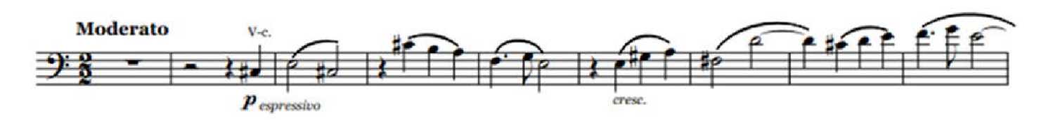 Пример 1. В.Я. Шебалин. Фортепианное трио A-dur, ор. 39 (1947). Часть 1, главная партия, т. 1-9: