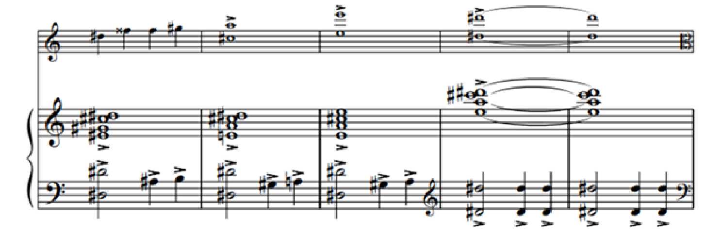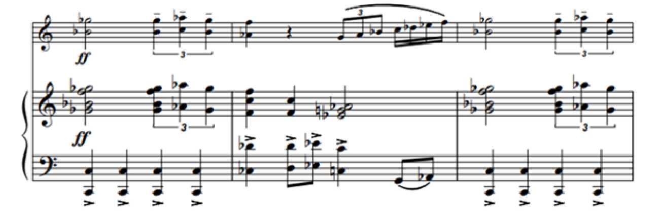 Канонический принцип изложения становится основным в развитии инструментальной фактуры. Она достигает насыщенного звукового объема с появлением альтерированных аккордовых последовательностей рояля. Восходящий подголосок, возникающий в его басовом регистре (пример 10), воспринимается гармонической основой ансамблевого диалога уже в среднем эпизоде, со сменой знаков (G-dur) приобретающем совсем другой эмоциональный характер.