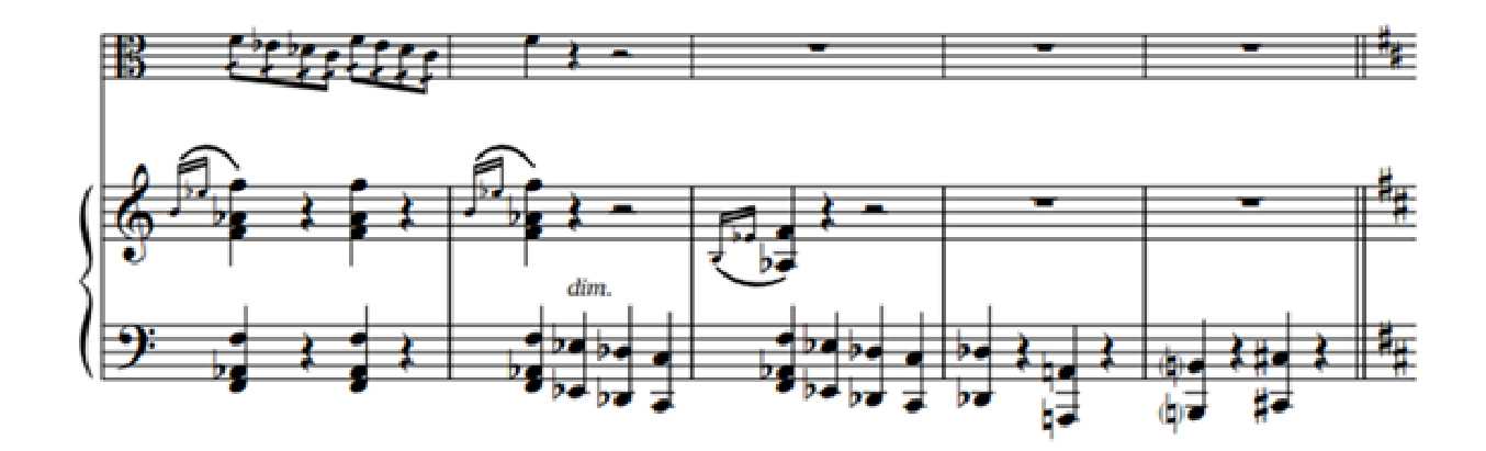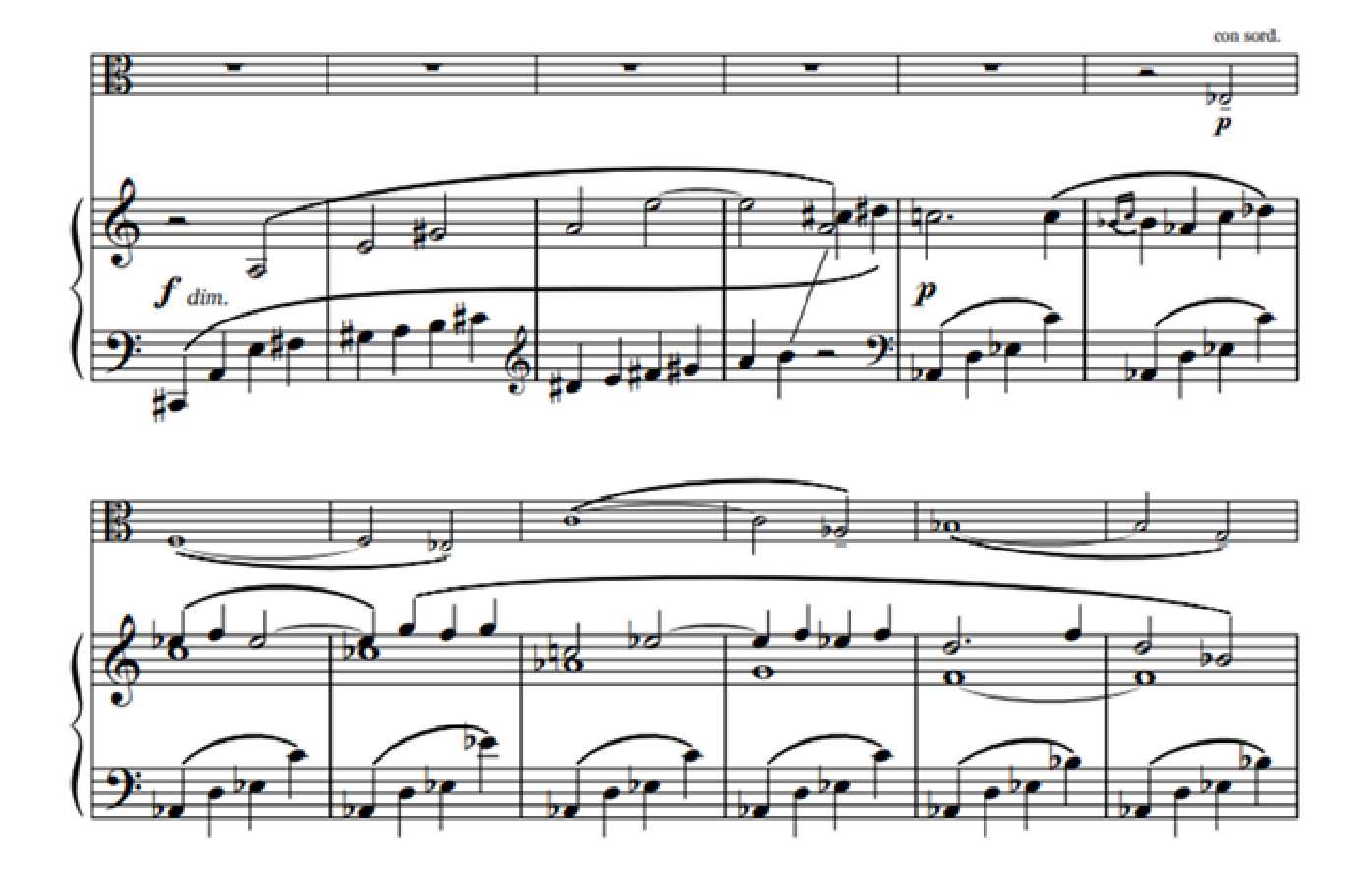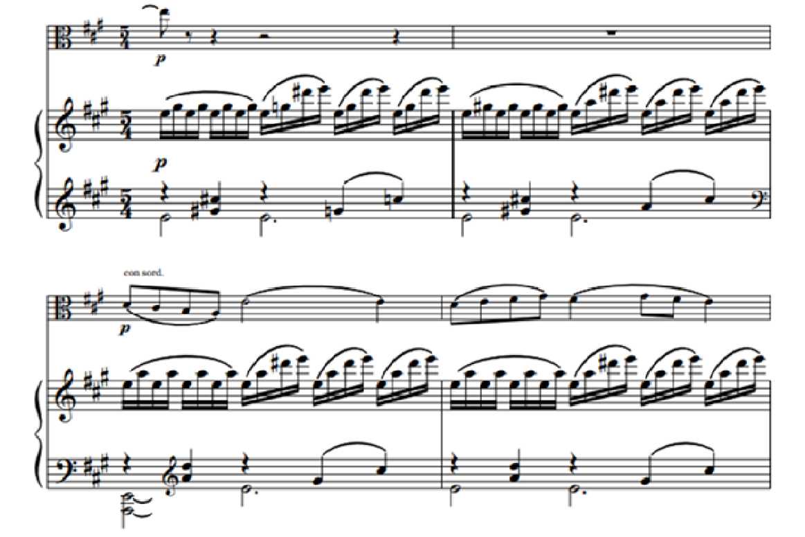 Возвращение к репризе подготавливается двутактовым предыктом, новым пятидольным метром и фантазийным кружевом шестнадцатых рояля, на фоне которых вновь звучит первая тема альта (пример 11). Сурдина помогает создать далекий и ирреальный образ прошедшего времени, мечту, исчезающую в тающих альтовых флажолетах и прозрачных гармониях фортепиано.