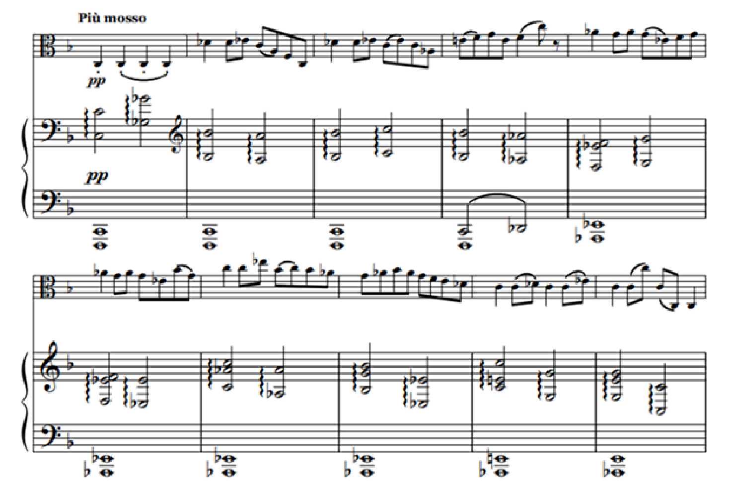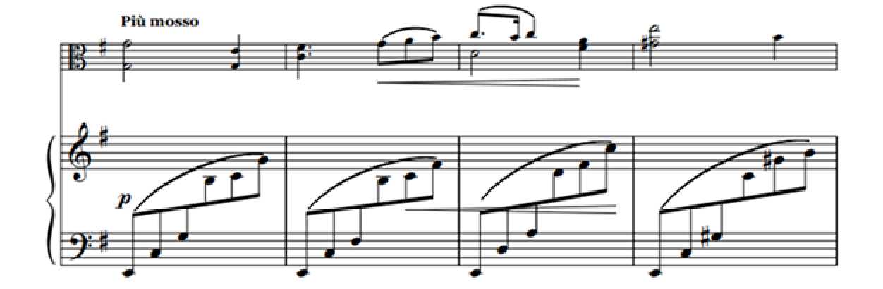 Здесь наблюдается тот же самый принцип организации музыкального материала. Из ясно очерченной мелодической линии, как из тематического ядра, формируется полифоническая ткань ансамбля, сотканная из взаимодействия ключевых интонационных формул. Ярко и выразительно трактуются сольные реплики рояля – смысловые вершины финала. Идущие одна за другой в череде хроматизмов, отклонений и модуляций, они создают напряжение, подготавливающее наступление короткой репризы. Ей предшествуют канонические проведения тематических отрывков в партиях альта и фортепиано, резкие звуковые контрасты, приводящие в итоге к главной теме финала. Собранно и сжато, в едином звуковом потоке соединяются основные музыкальные образы – лирико-драматические, наполненные экспрессией и благородной патетикой. Именно из них в затаенной и сумрачной тишине piu mosso (F-dur) рождается кода всей сонаты (пример 18). Стремительная тема альта, гуслевые переборы фортепиано и его торжественная аккордовая поступь воспринимаются целостно в красочном колокольном звучании. На этой основе максимально эффектно слушается блестящий поток альтовых пассажей, переходящих в скандированные реплики последних ансамблевых унисонов этого чрезвычайно яркого полотна.