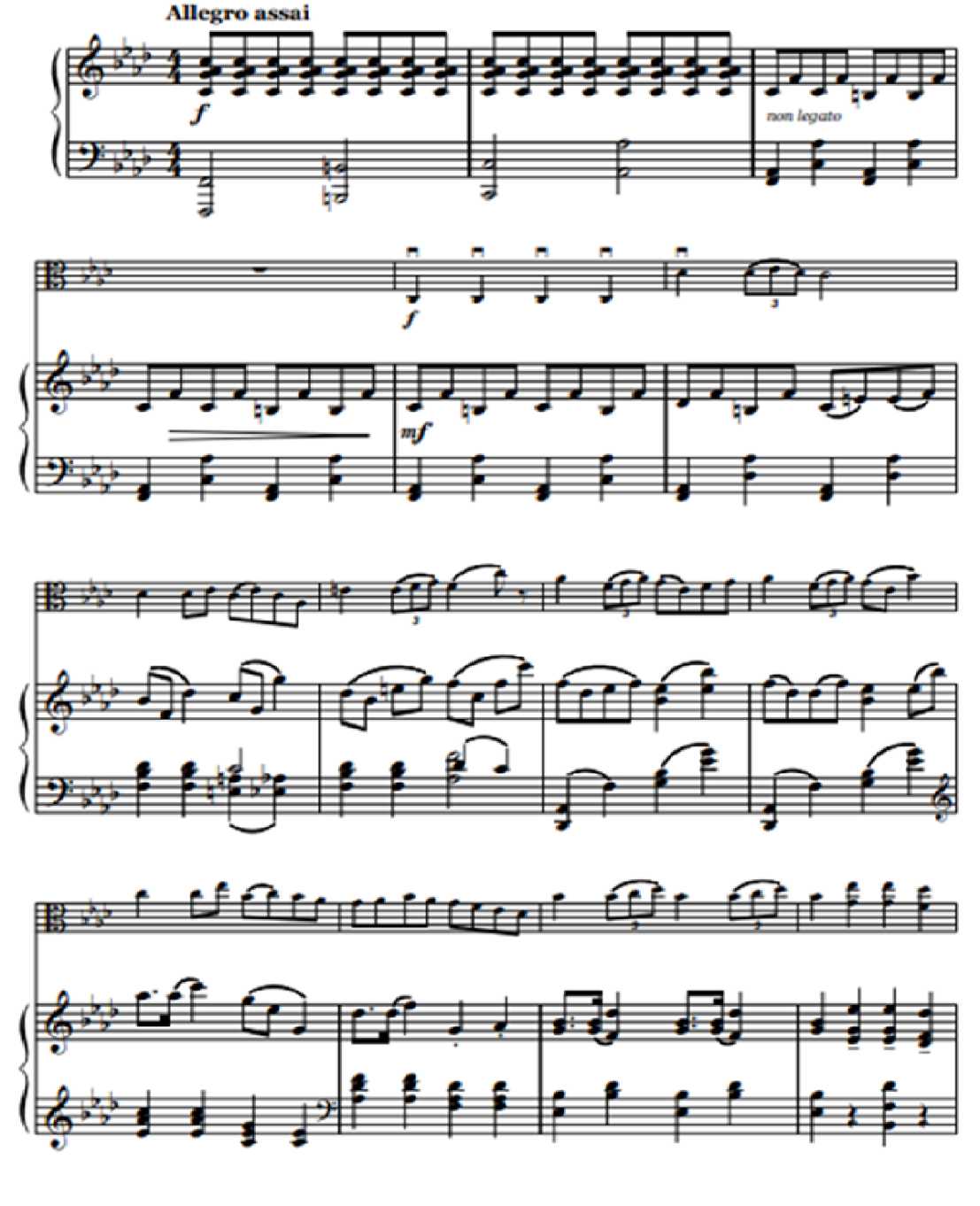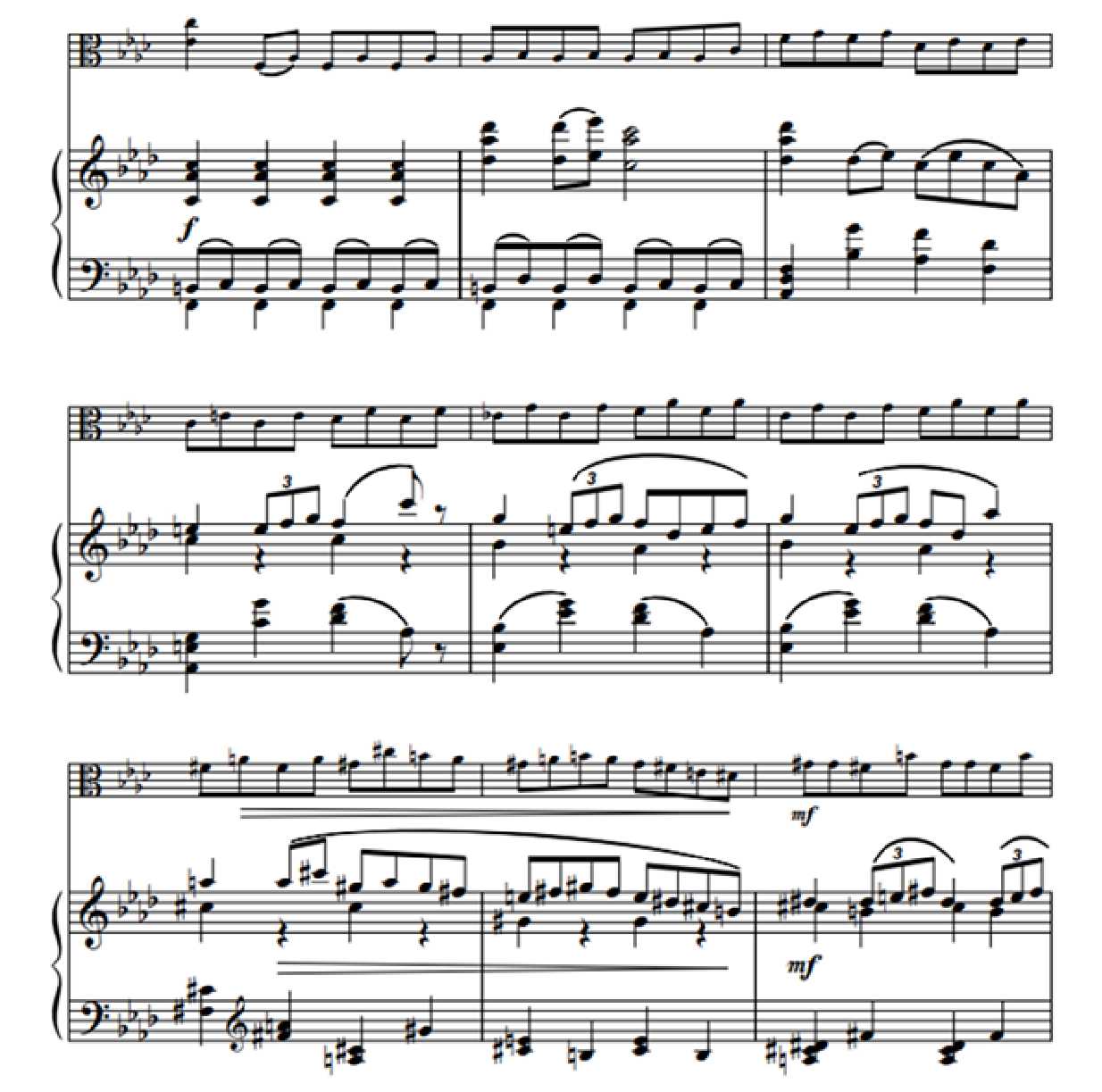 Расширятся его звуковой диапазон, меняется регистровая краска, соответствуя появлению новой темы – возвышенной и чувственной, в фугированном трехголосном изложении альта и фортепиано. Традиционный пунктир насыщает музыкальную ткань динамикой и экспрессией, приводя к масштабной кульминации, унисонным скандированиям отдельных тематических элементов.