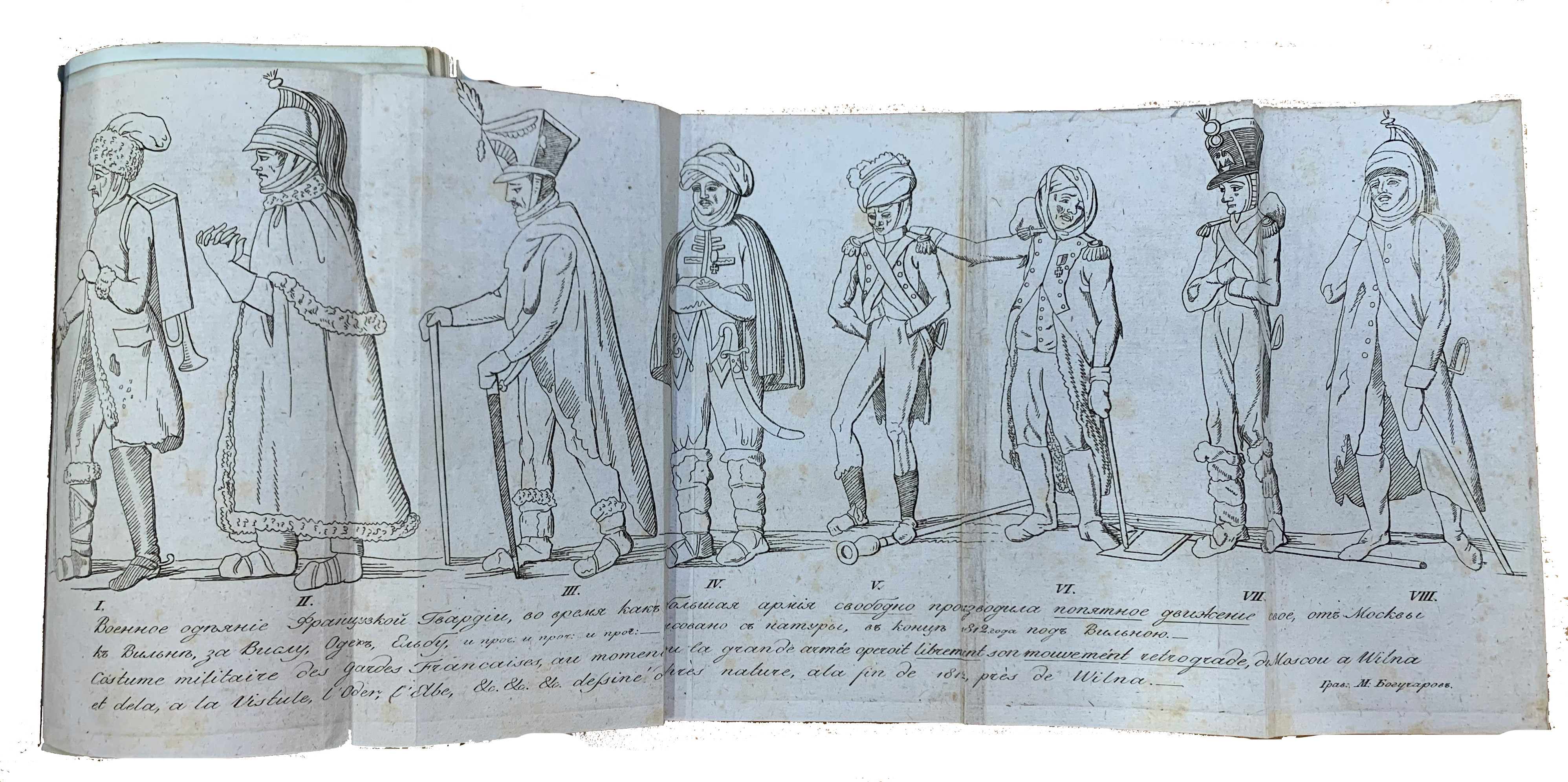 Рис. 5. Грав. М. Богучаров. Военное одеяние французской гвардии во время как большая армия свободно производила попятное движение свое от Москвы к Вильне за Вислу, Одер, Эльбу, и проч., и проч. и проч. («Сын Отечества», 1813 г., Ч. 5, № 19). Офорт. Лист – 43,8 х 18,3 см. Фото автора статьи