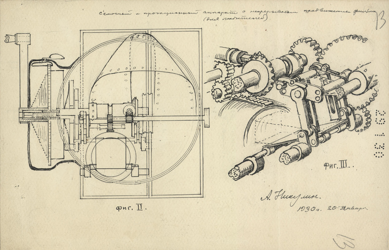 Рис. 1. Никулин А.О. Съемочный и проекционный аппарат с непрерывным продвижением фильма (для любителей). 20 января 1930 г. Чертеж. Ватман. Подлинник. РГА в г. Самаре. Ф. Р-1. Оп. 2-5. Д. 1511. Л. 13