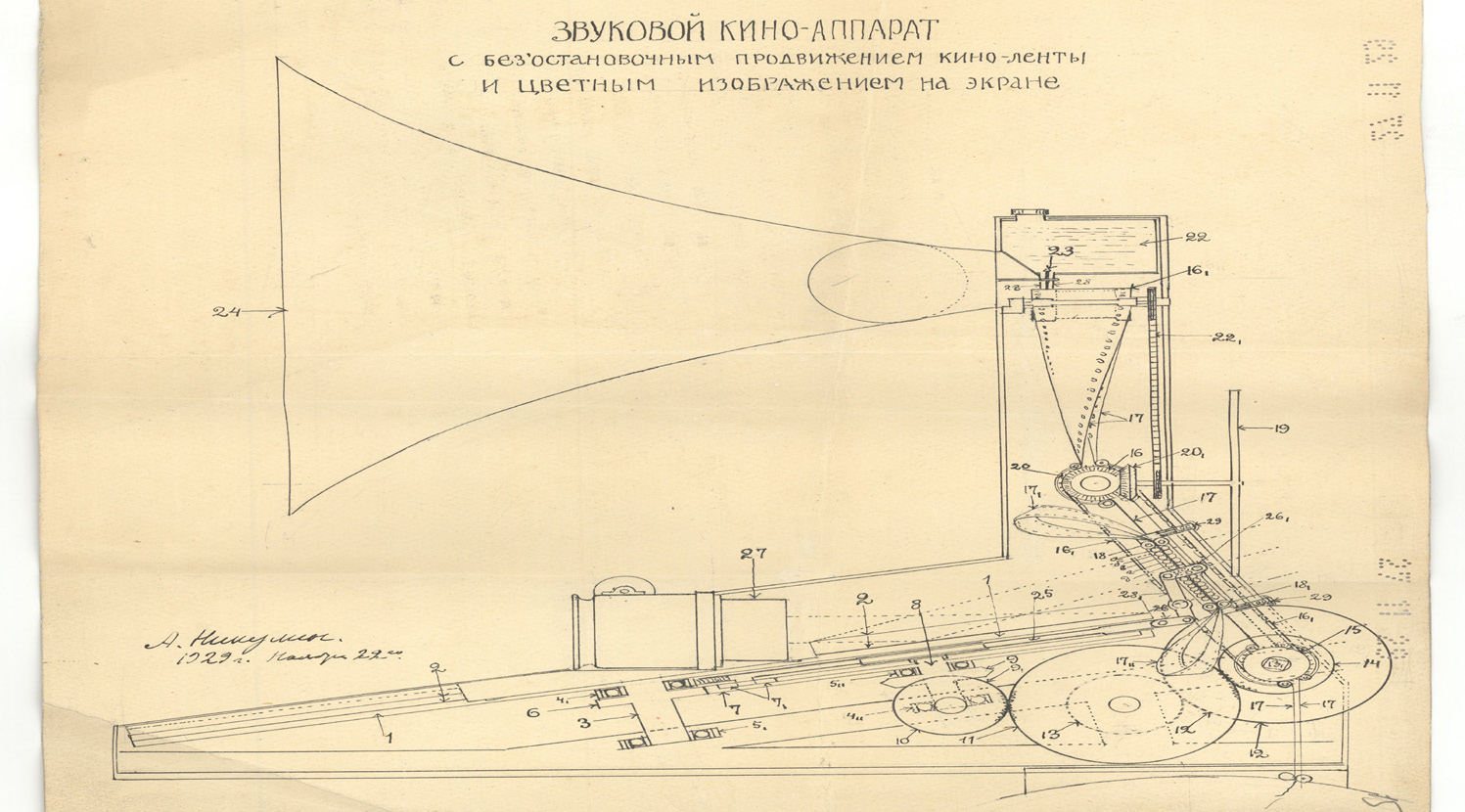 Рис. 2. Никулин А.О. Звуковой киноаппарат с безостановочным продвижением киноленты и цветным изображением на экране. 27 ноября 1929 г. Чертеж. Ватман. Подлинник. РГА в г. Самаре. Ф. Р-1. Оп. 1-5. Д. 33495. Л. 15