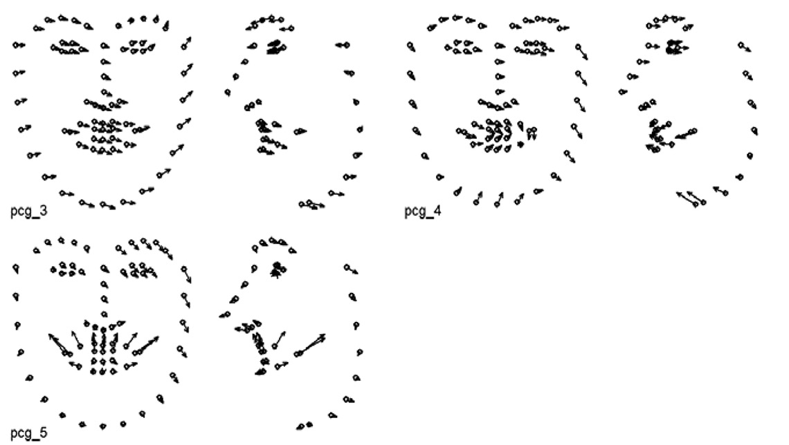 Рис. 24. Пространственная реконструкция первой главной компоненты для 12 наборов данных (экспрессия гордости). Примечание: Показаны средние значения координат ключевых точек и вектора изменения их положения. Рисунок демонстрирует низкую вариативность первой главной компоненты для включенных в анализ наборов данных.