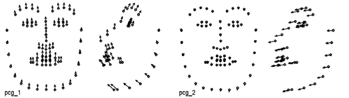 Другой вариант – проведение анализа главных компонент на основе ранее полученного набора координат ключевых точек, при котором часть компонент «зафиксирована» и отражает характерные мимические паттерны, связанные с набором AU, предположительно присутствующих в анализируемой мимике.