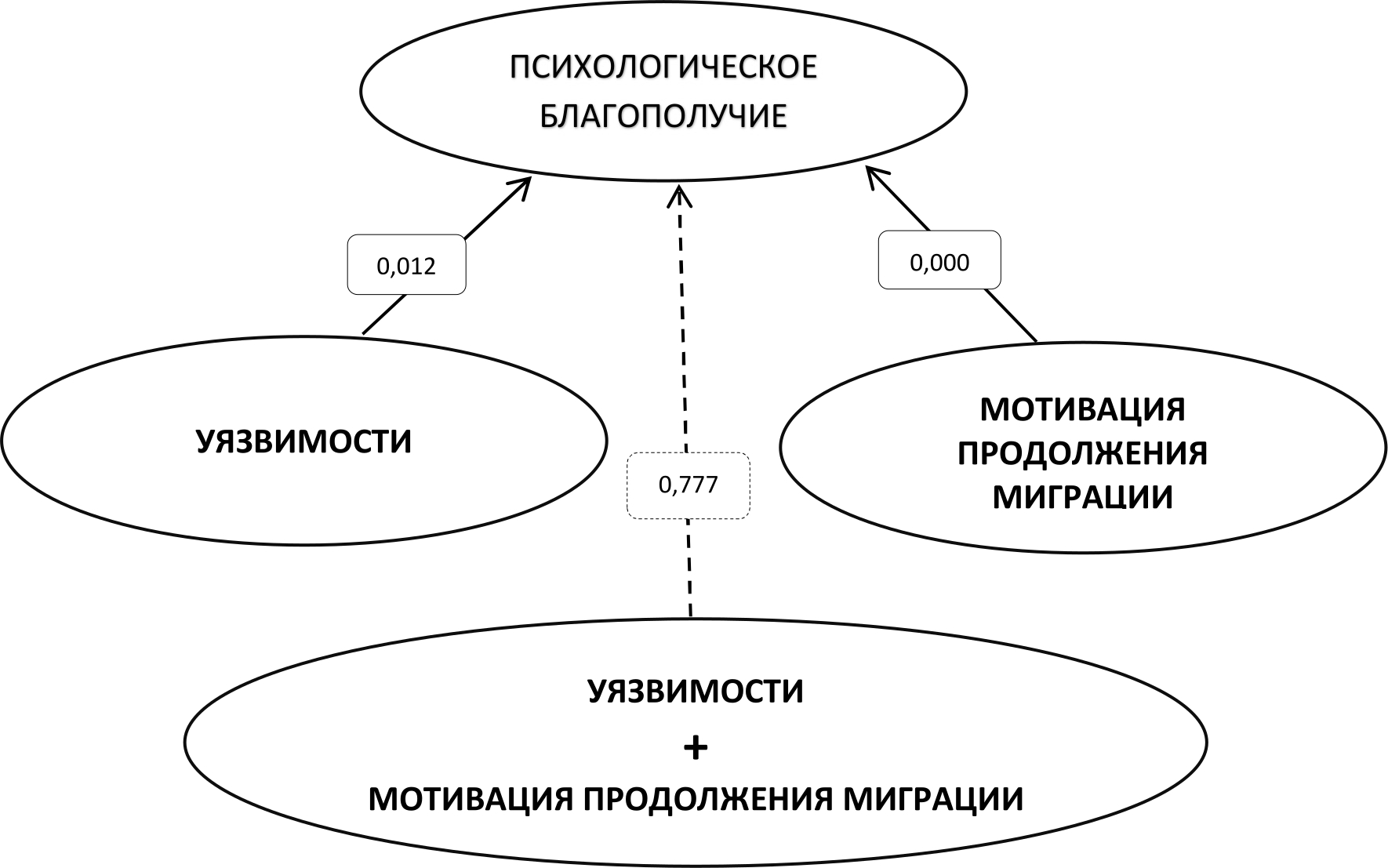Мы обнаружили, что факторы уязвимости и мотивации продолжения миграции воздействуют на психологическое благополучие лишь по отдельности, но совместного влияния нет. Таким образом, наличие смыслового обоснования продолжения миграции влияет на психологическое благополучие независимо от принадлежности к группе уязвимых мигрантов. То есть, четкая смысловая формулировка обеспечивает психологическое благополучие, даже если у мигранта в прошлом было не только одно, но и несколько травматических событий.