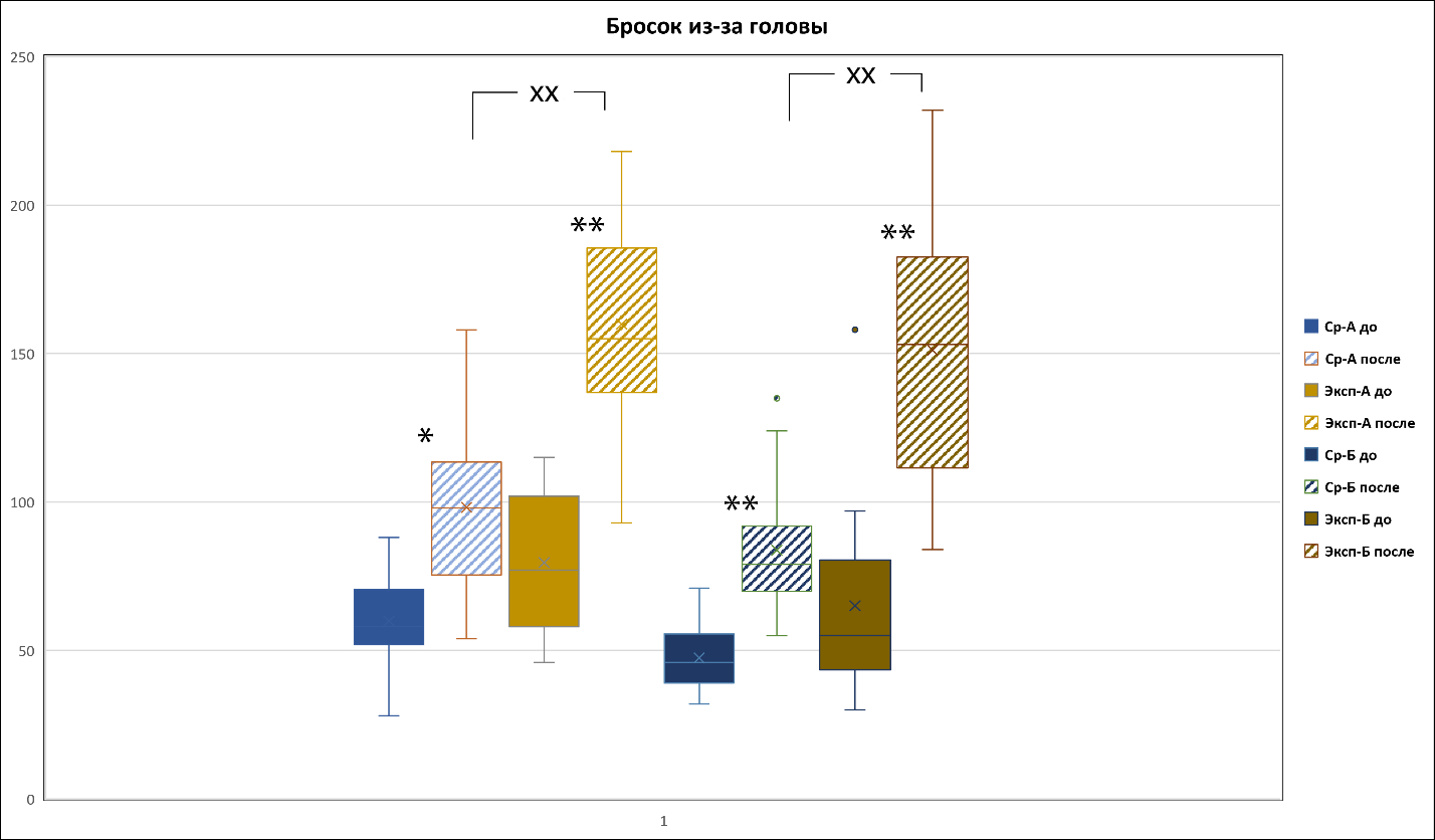 Для сопоставления прогресса по отдельным показателям в изучаемых подгруппах были выбраны такие параметры, как бросок из-за головы и прыжок. Эти параметры отражены на рисунках 1 и 2, соответственно.