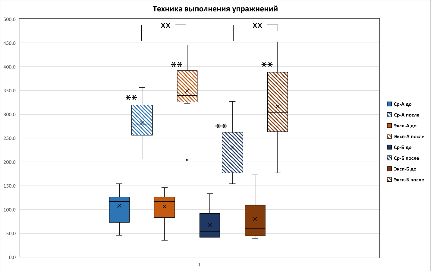 Примечание: По оси У – длина прыжка в см. * достоверные различия между подгруппами по критерию Манна-Уитни до и после курса занятий (**– p < 0,01, ***– p < 0,001), х – достоверные различия между экспериментальной и сравнительной группами.